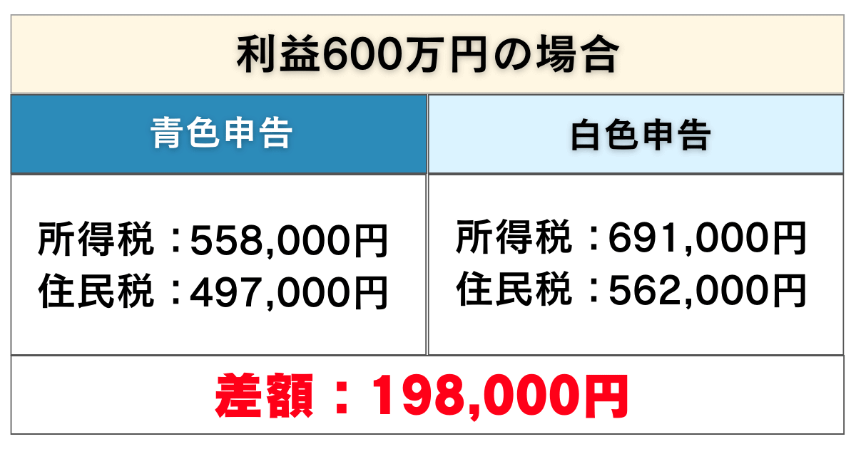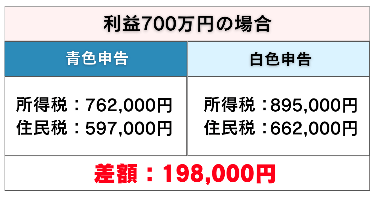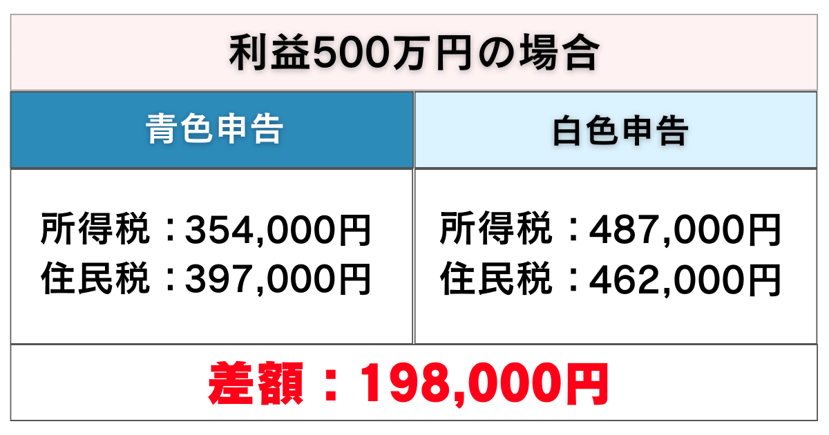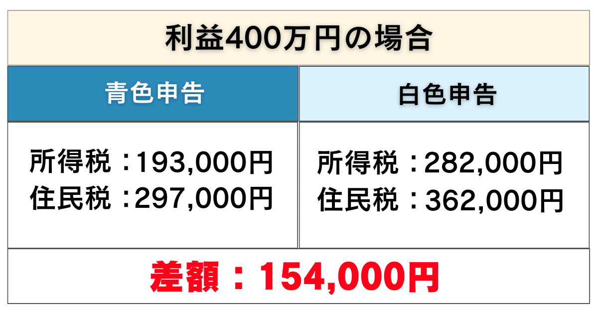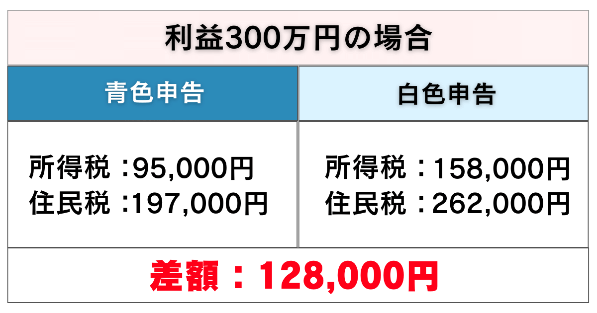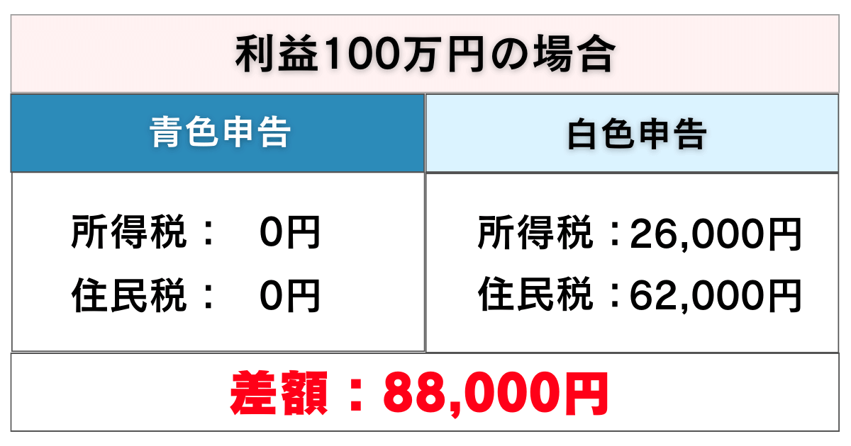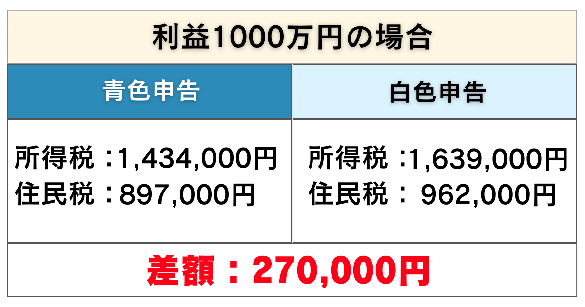 利益100万円の時から比較してもやはり、青色申告の方が白色申告より税金が安くなることが分かります。