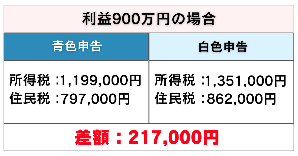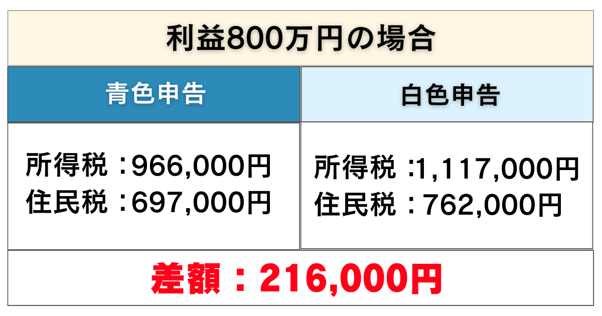 利益800万円の時は、白色申告は【695万円超〜900万円以下】の欄で税率が23%、青色申告は【330万円超〜695万円】の欄で税率が20%なので、差額が変わりました。
